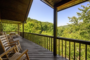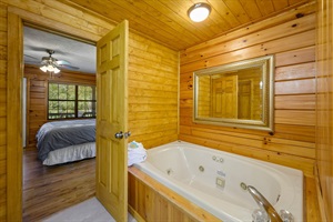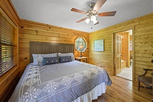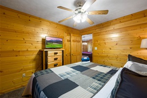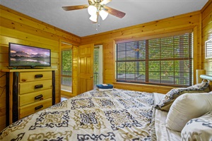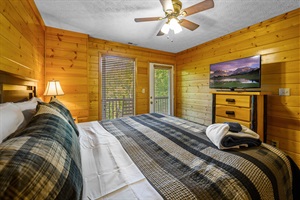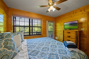 The master bedroom is also located on this level and includes a king size bed, TV, large jetted tub and a private bathroom with a walk-in shower. The main level also has a large balcony, with ample seating, to enjoy the fresh mountain air.