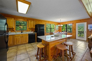 When you arrive, you’re greeted by a welcoming porch that spans the front of the cabin. Inside, on the main level, you’ll find a spacious fully equipped kitchen and dining area great for preparing meals and entertaining.