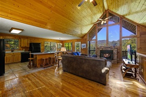 Just off the kitchen and dining area is the living room, with a seasonal stone gas fireplace, a comfortable sectional sofa and a large flat screen TV.