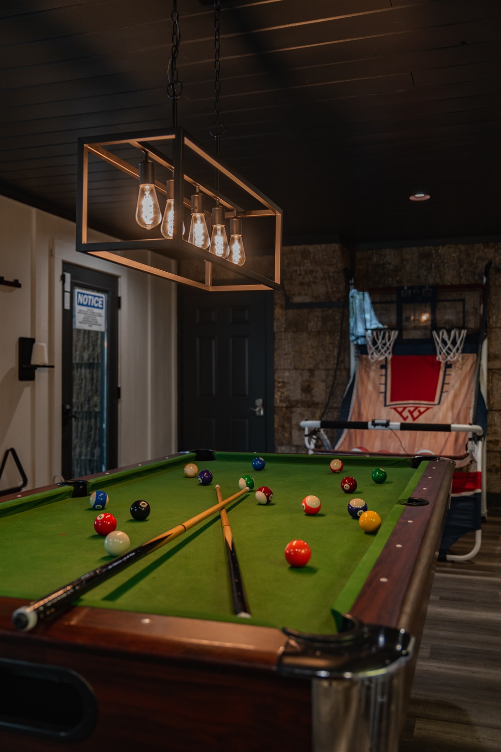 🎱Game room with pool table, basketball game, video games, TV and sofa